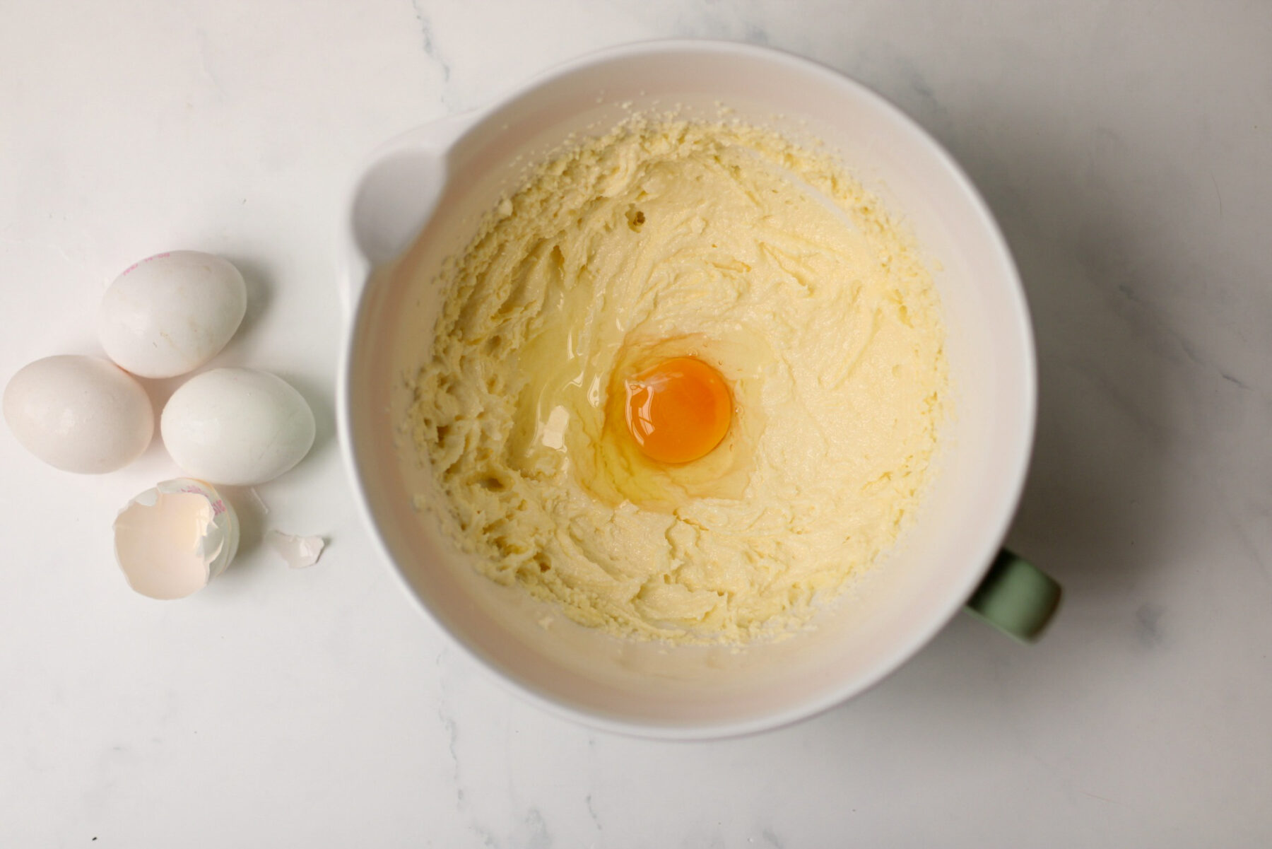 Die Eier gibst Du im Anschluss einzeln hinzu und rührst jedes etwas 30 Sekunden unter. So sorgst Du für eine schöne Festigkeit die Dir später das Volumen garantiert.