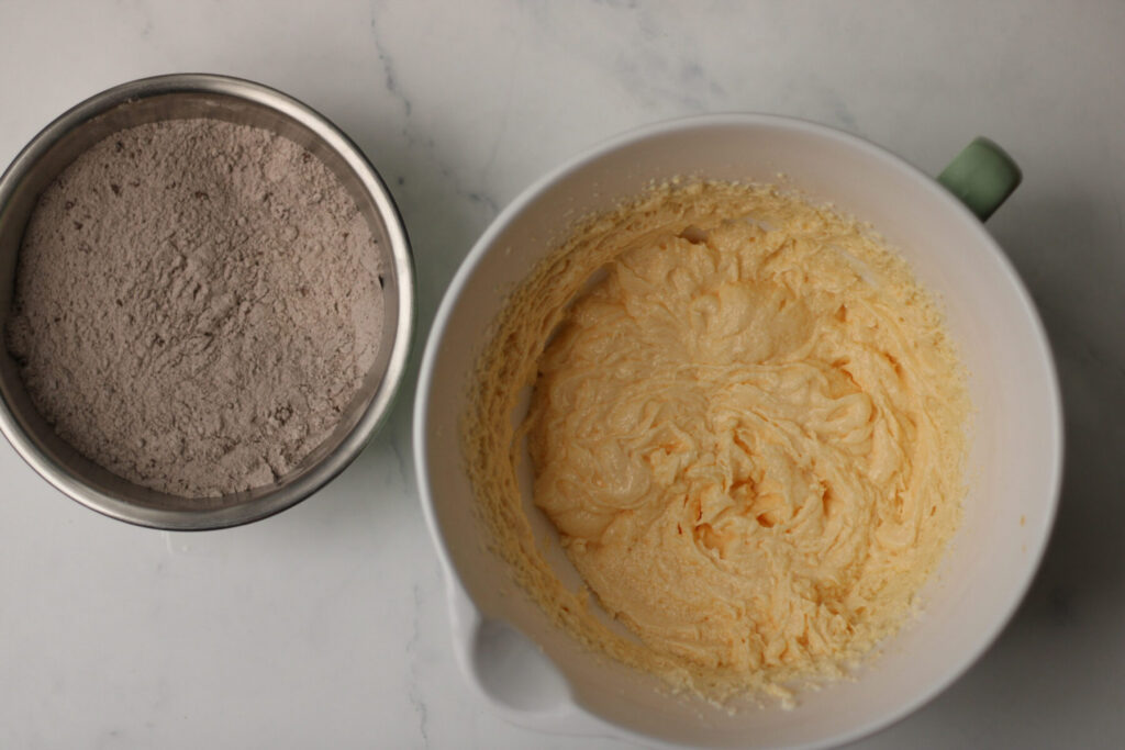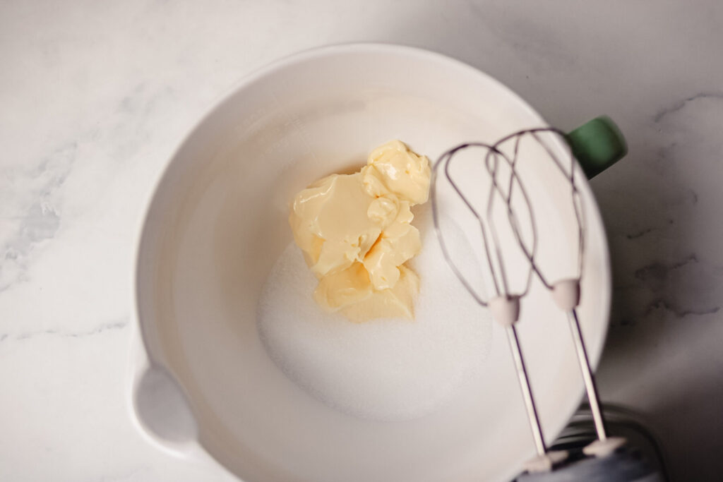 Gib nun die weiche Butter sowie Zucker und Vanillezucker in eine Rührschüssel und verrühre es zu einer hell weißen Masse.