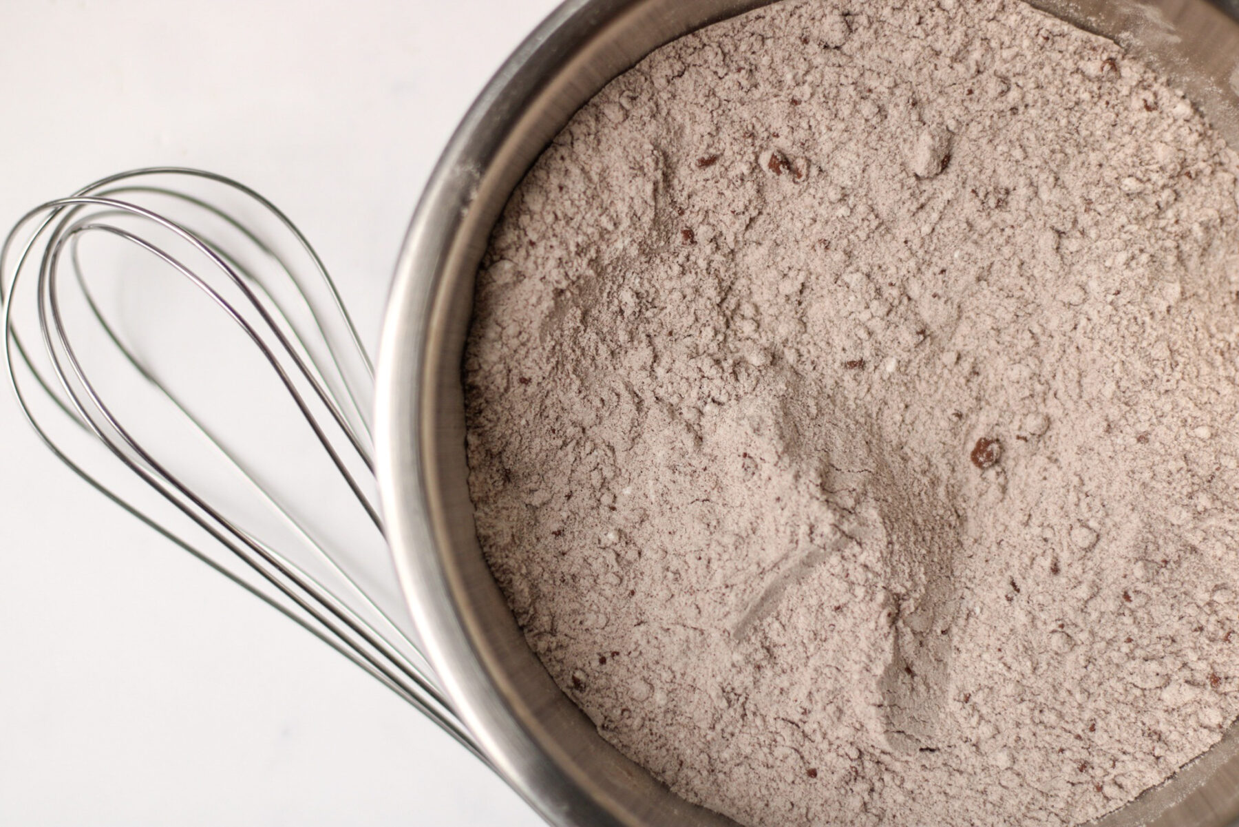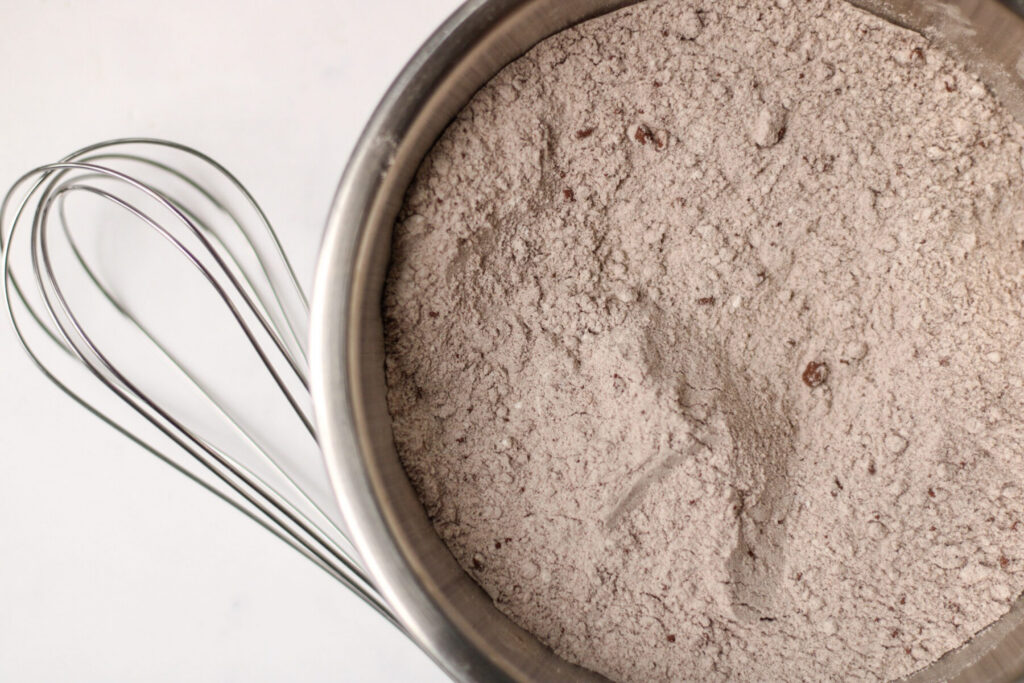 Vermenge nun das Mehl mit Backpulver, Zimt sowie dem Backkakao in einer separaten Schüssel. So verhinderst Du Schokoklümpchen und das Backpulver ist perfekt verteilt.