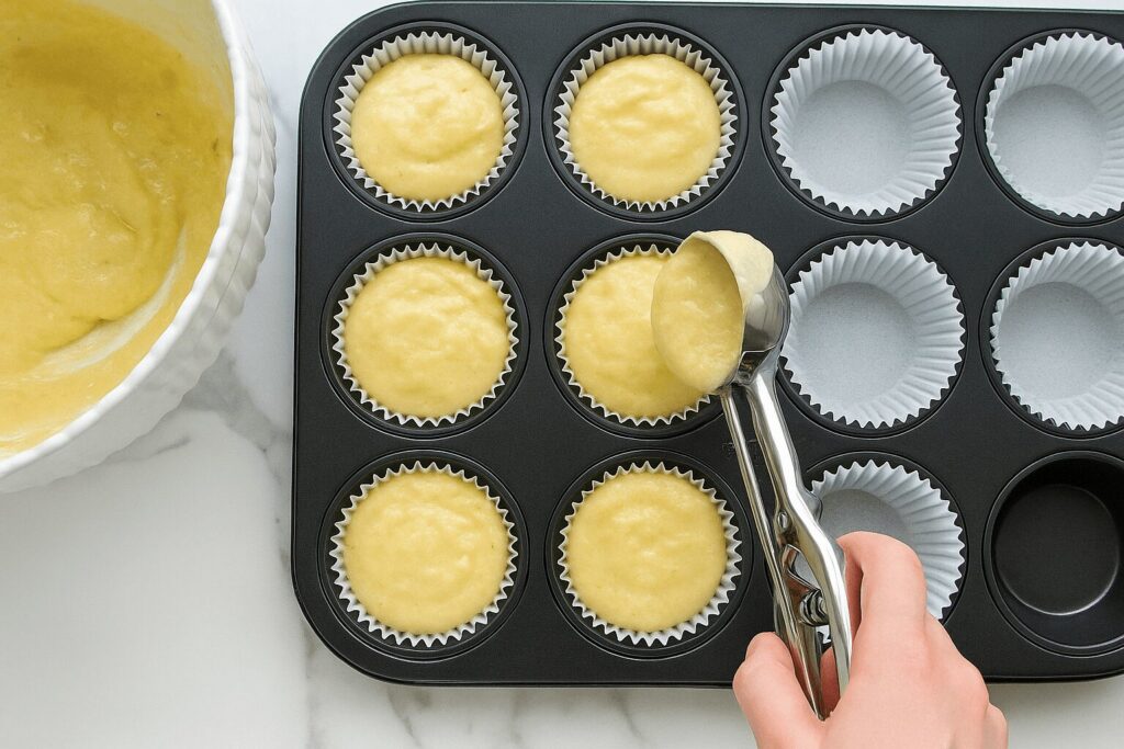 Den Muffin Teig geben wir zum Schluss mit Hilfe eines Eisportionierers in die vorbereiteten Papierförmchen. So wird nichts verkleckert und du hast direkt die passende Menge bereit. Alternativ kannst du auch zwei Teelöffel dafür verwenden, das funktioniert natürlich ebenfalls sehr gut. Die Muffins dürfen nun bei 160 Grad Umluft für ca. 20-25 Minuten goldbraun gebacken werden.