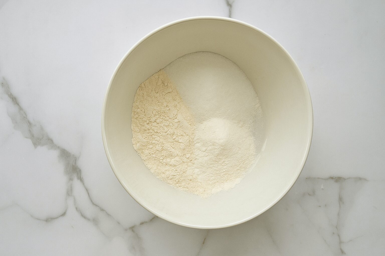 In einer Rührschüssel mischen wir erstmal alle trockenen Zutaten wie Mehl, Zucker, Backpulver und eine Prise Salz.