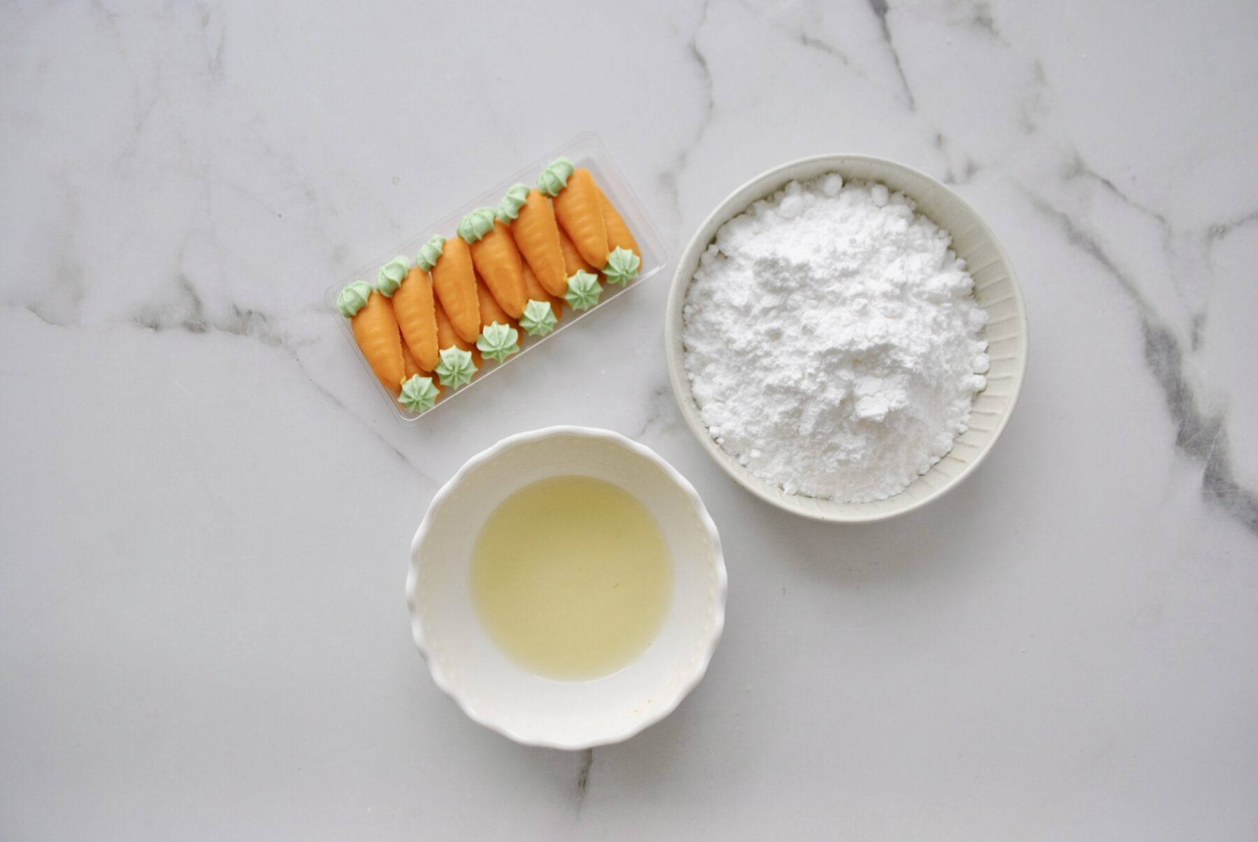 Währenddessen kannst du dir den Zitronenzuckerguss anrühren und die Muffins mit je einem Teelöffel Zuckerguss und einem Marzipanrübli dekorieren.