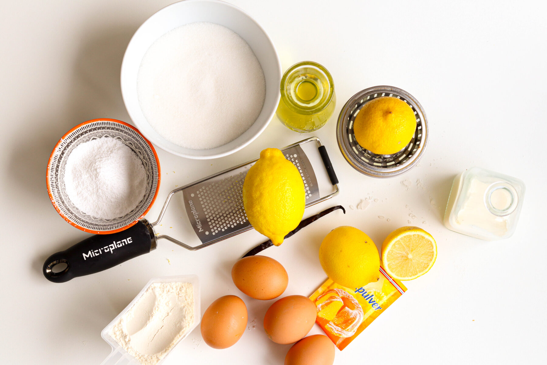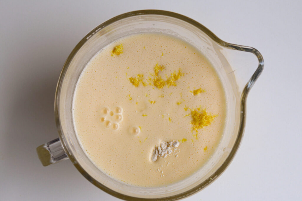Danach Milch, Zitronensaft und Öl hinzufügen und alles gut vermischen. In einer separaten Schüssel Mehl, Stärke und Backpulver vermengen und dann zur Eier-Mischung geben. Den Zitronenabrieb dazugeben und nochmals alles gründlich miteinander verrühren.