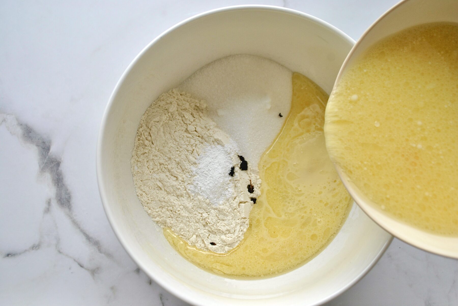Nun kommt die flüssige Zutaten Mischung in die Rührschüssel zu den trockenen Zutaten. Alles nur kurz zusammen aufschlagen bis ein glatter Teig entsteht.