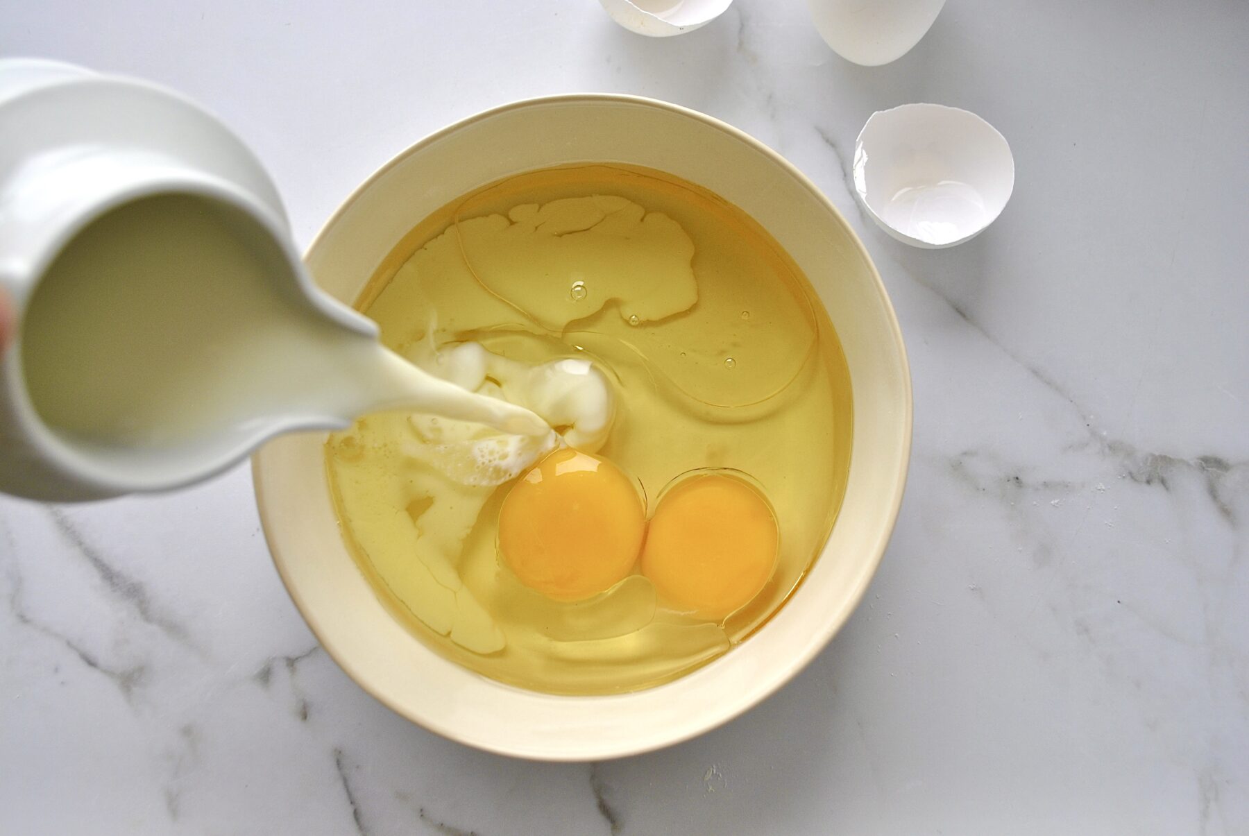 Danach sind die feuchten Zutaten an der Reihe. Du gibst die Eier, Milch und das Öl in eine separate kleine Schüssel und mischt sie zusammen.
