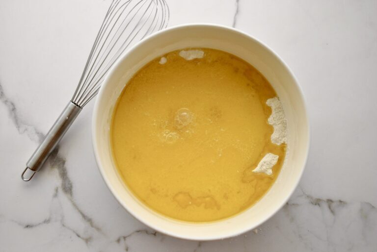 Nun kommen die nassen Zutaten wie, flüssige Butter, Milch und Eier hinzu. Kurz mit einem Schneebesen oder Handrührgerät zu einem glatten Teig vermengen.