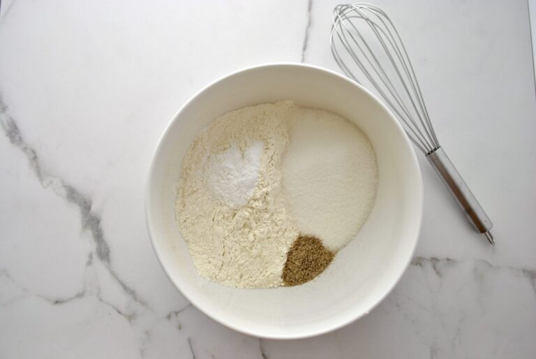 Danach mischen wir alle trockene Zutaten wie Mehl, Zucker, Vanillezucker und Backpulver in einer Rührschüssel am besten mit einem Schneebesen.
