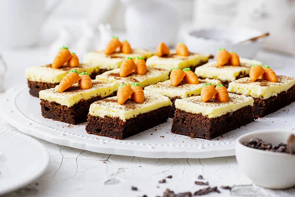Hier haben wir mal etwas Abwechslung für Deine Kuchentafel. Der Schoko Karottenkuchen vom Blech ist das Highlight der Osterbäckerei für alle Schokoholics. Warum nicht mal einen Karottenkuchen mit Schokolade backen? Wir toppen ihn mit einer köstlichen und einfachen Creme und mit ein bisschen Deko ist der perfekte Schoko Karottenkuchen für Dein Osterfest fertig.
