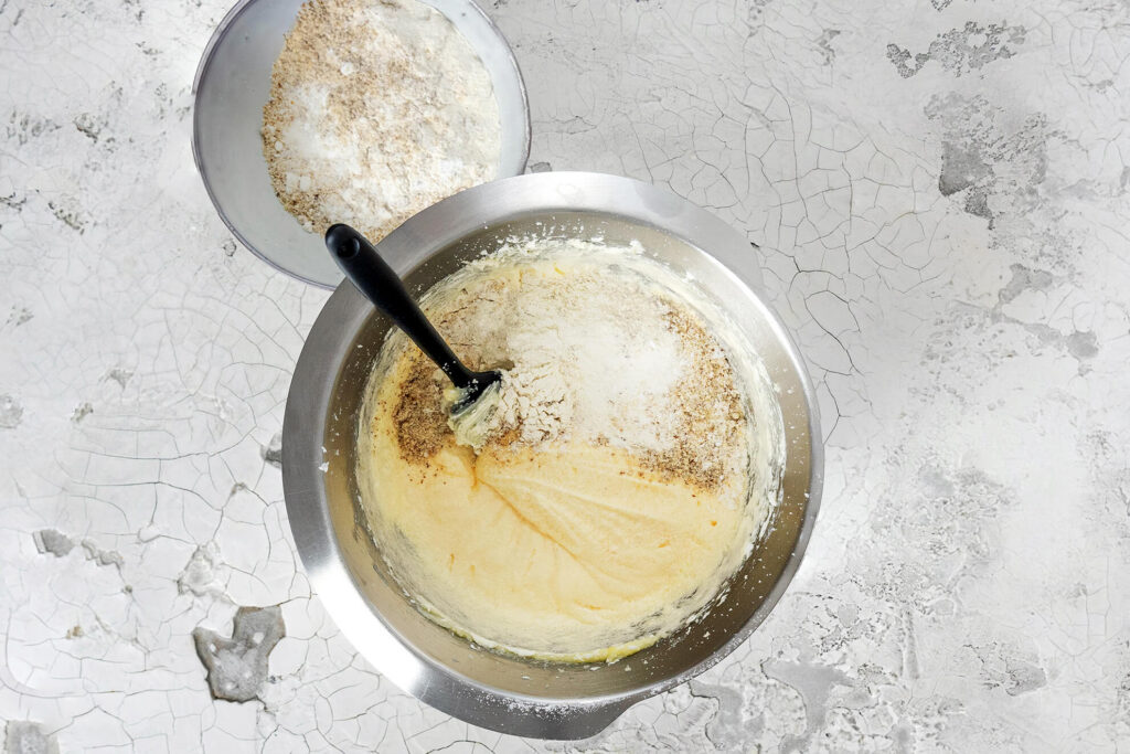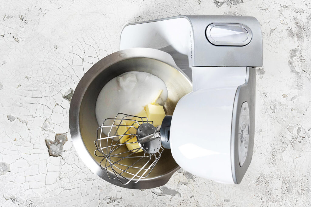 Schlage die Butter zusammen mit Salz, Zucker und Vanillezucker zu einer hellen, cremigen Masse auf. Verrühre die Eier mit der Vanillepaste in einem Messbecher und gib sie anschließend zügig zur Butter-Zucker-Mischung hinzu. Vermenge alles gründlich.