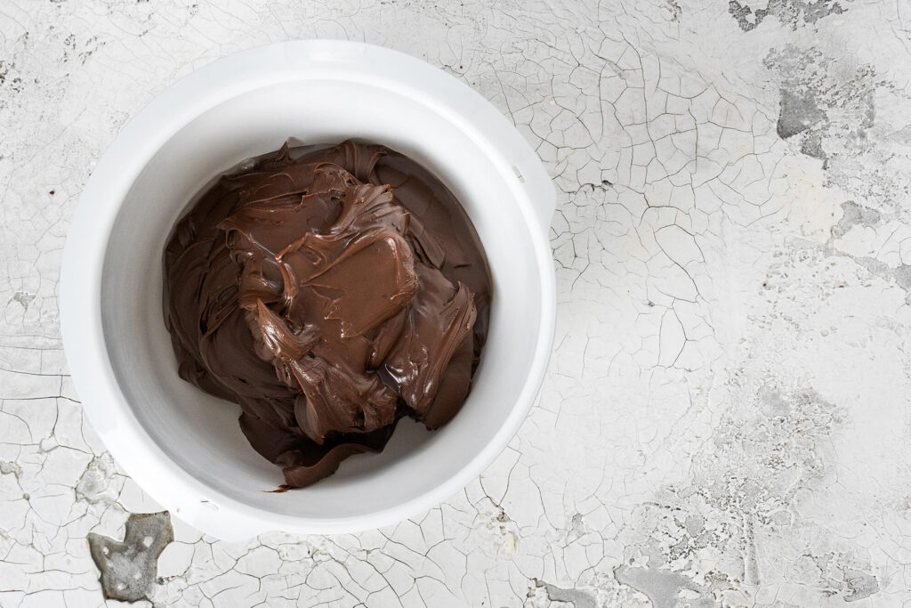 Erhitze die grob zerbrochene Schokolade zusammen mit der Schlagsahne in einem kleinen Topf, bis sie geschmolzen ist. Stell die Masse anschließend kalt, bis sie anfängt fest zu werden.