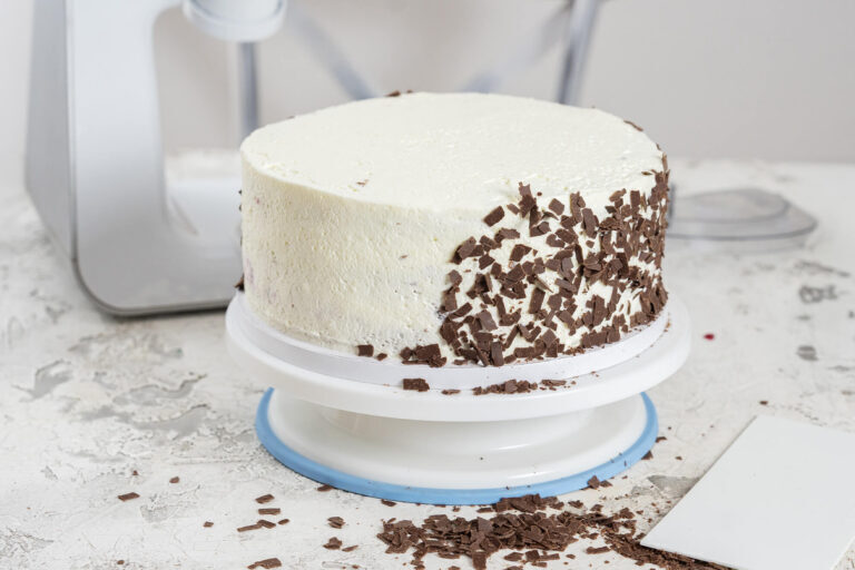 Ist die Torte komplett mit Sahne eingestrichen, kannst du den Rand direkt – also noch vor dem erneuten Kühlen – mit Raspelschokolade verzieren. Gib dazu eine kleine Menge der Schokoraspel in die Hand und drücke sie vorsichtig von unten nach oben an den noch weichen Sahnerand. Arbeite dich Stück für Stück um die Torte herum und drehe sie dabei langsam auf dem Drehteller. Eine Teigkarte oder ein kleiner Tortenstreicher helfen dir dabei, die Schokolade gleichmäßig anzudrücken, ohne die Sahneschicht zu beschädigen. Wenn du möchtest, kannst du zusätzlich etwas Raspelschokolade mittig auf der Tortenoberfläche verteilen.
