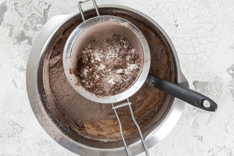 Ist die Eiermasse schön stabil und voluminös, gibst du die vorbereitete Mischung aus Mehl, Stärke und Kakao nach und nach durch ein Sieb direkt zur Masse. Arbeite mit einem Teigspatel und hebe die trockenen Zutaten vorsichtig unter – idealerweise in ruhigen Bewegungen von unten nach oben. So vermeidest du Mehlnester und erhältst gleichzeitig die eingeschlagene Luft, die für die Lockerheit des Biskuits entscheidend ist.