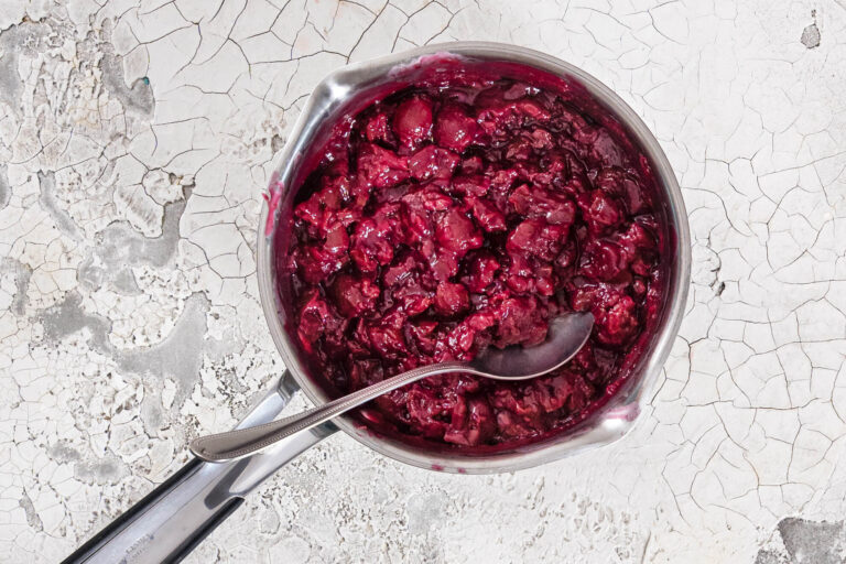 Gib die abgetropften Schattenmorellen in die heiße, angedickte Saftmasse und hebe sie vorsichtig unter, damit die Früchte möglichst ganz bleiben. Lass die fertige Kirschfüllung anschließend vollständig auskühlen – am besten bei Raumtemperatur, damit sie später die Sahnecreme nicht erwärmt oder verflüssigt.