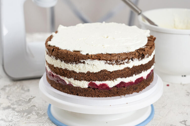 Sobald die Torte gut durchgekühlt ist, kannst du sie rundum mit der restlichen Sahnecreme einstreichen. Beginne dabei mit der Oberfläche und arbeite dich anschließend am Rand entlang nach unten. Am einfachsten geht das mit einer Winkelpalette oder einem Cremeschaber, während du die Torte langsam auf dem Drehteller drehst – so erzielst du ein gleichmäßiges, glattes Ergebnis. Wichtig: Hebe etwa ein Viertel der Sahne für die Dekoration auf. Diese füllst du später in einen Spritzbeutel, um damit am Rand der Torte dekorative Tupfen zu setzen.
