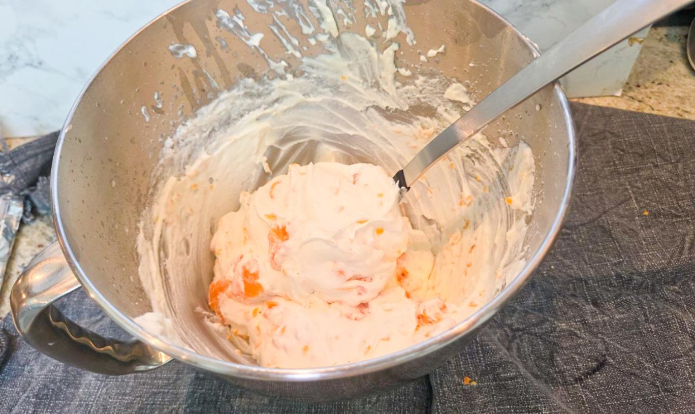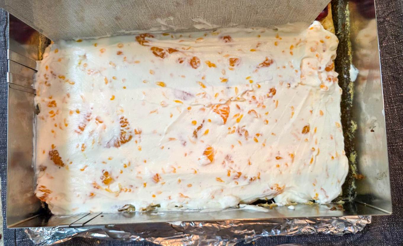 Die abgetropften Mandarinen unterrühren und die Mandarinen Quark Creme auf den Biskuit streichen.