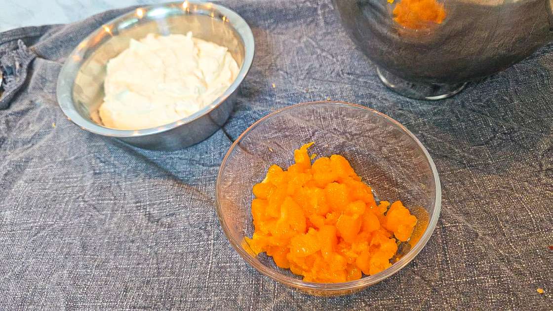 Mandarinen aus der Dose in ein Sieb geben und gut abtropfen lassen. Saft kann aufgefangen werden, braucht man aber nicht mehr.
