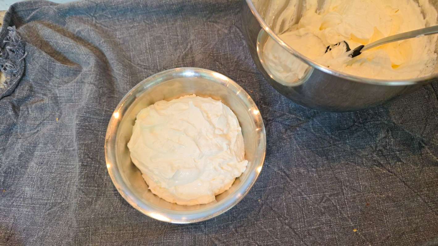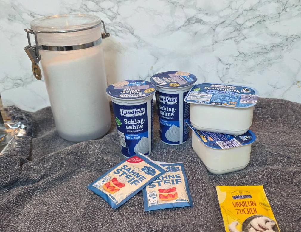 Sahne steif schlagen. Quark in eine große Schüssel geben und gut verrühren, bis er schön cremig ist. Zucker und Vanille unter den Quark rühren, dann die Sahne langsam mit einem Schneebesen unterziehen.