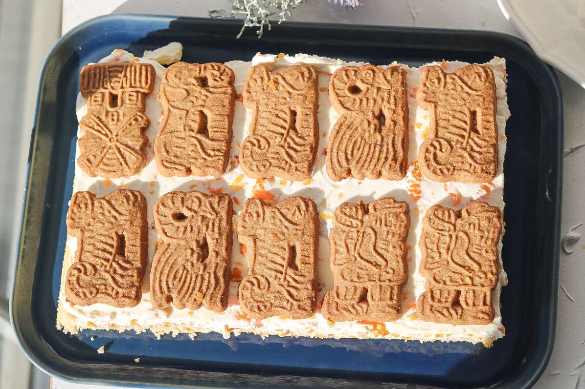 Wer keinen weichen Spekulatius mag, der gibt ihn erst direkt vorm Servieren auf den Kuchen.