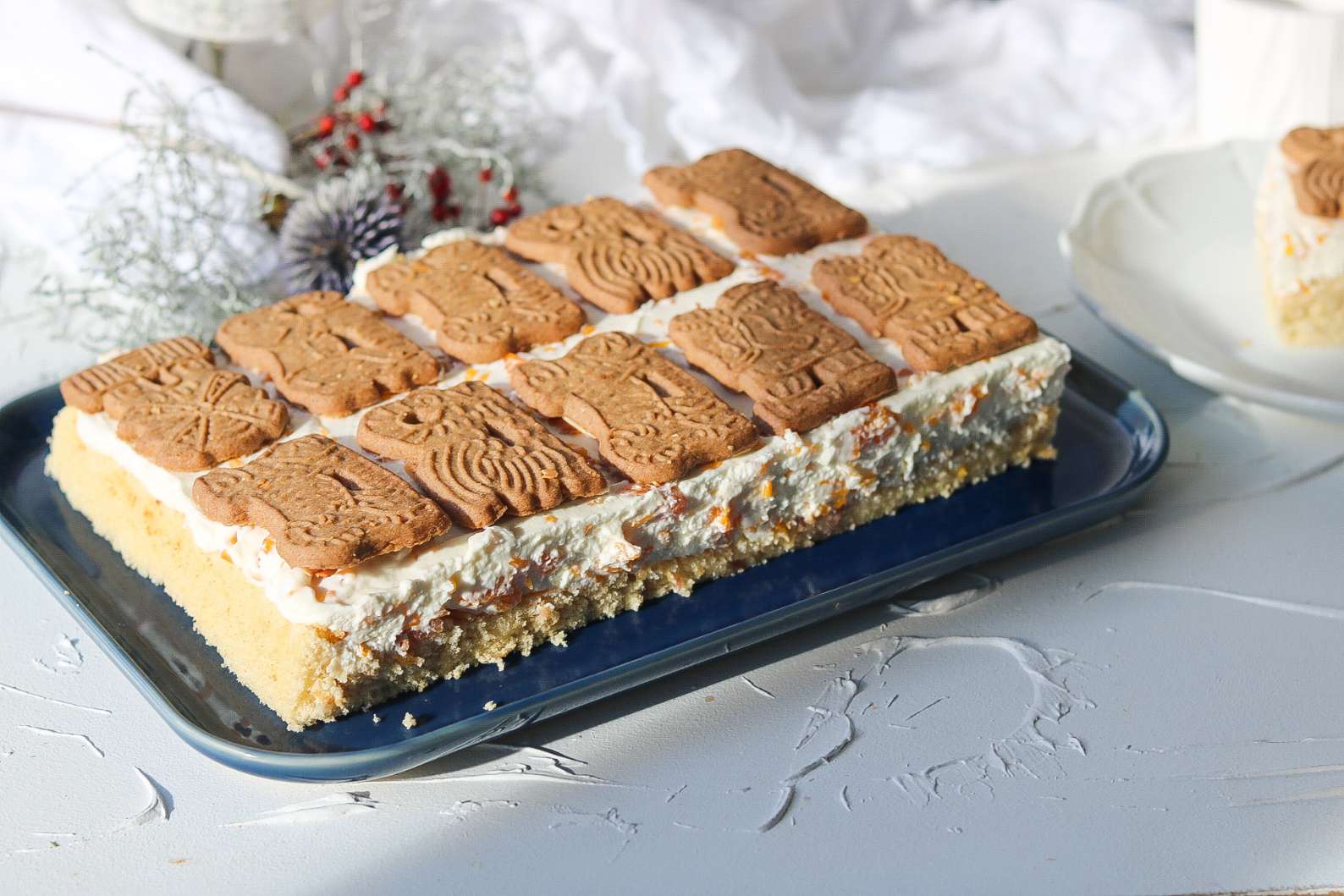 Weihnachtliche Spekulatiusschnitten mit Mandarinen Quarkcreme vom Blech – luftiger Biskuit, cremige Quarksahne gemischt mit Mandarinen und knuspriger Spekulatius. Einfach aber unwiderstehlich lecker!