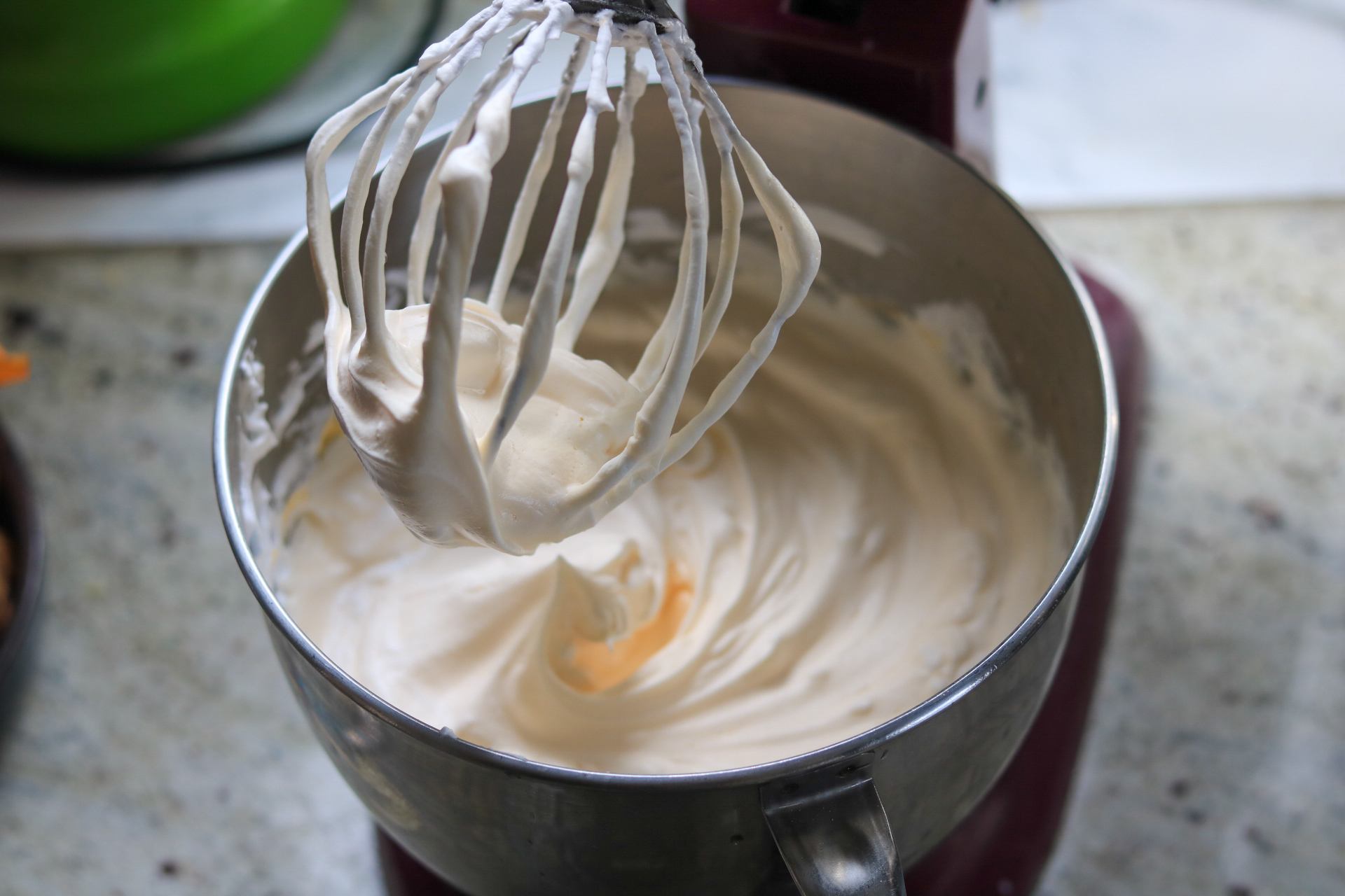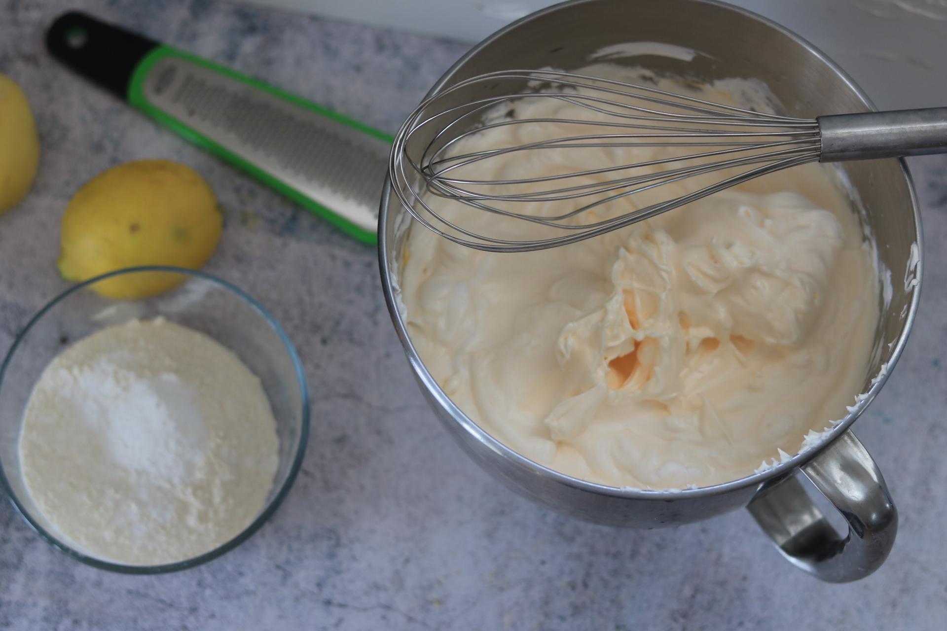 Mehl, Stärke und Backpulver auf die Eimasse sieben und mit einem Schneebesen behutsam und mit Ruhe unterheben.
