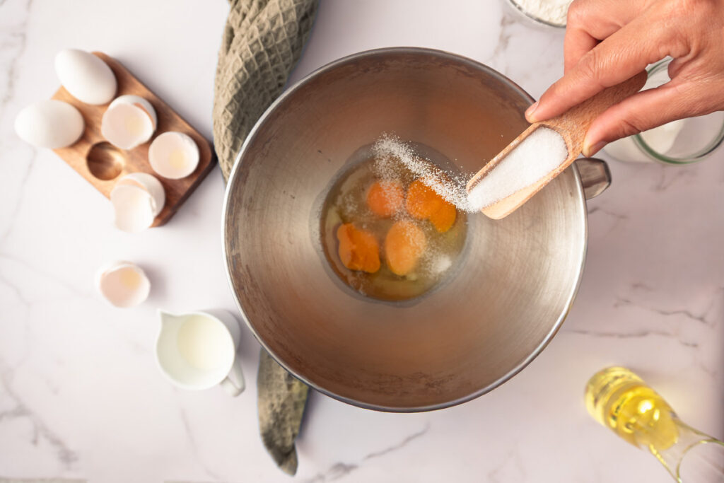 Nun schlägst du die Eier zusammen mit dem Zucker und dem Salz schaumig.