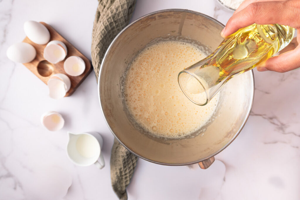 Gieße nun das Rapsöl und den Orangensaft langsam dazu und rühre alles unter.