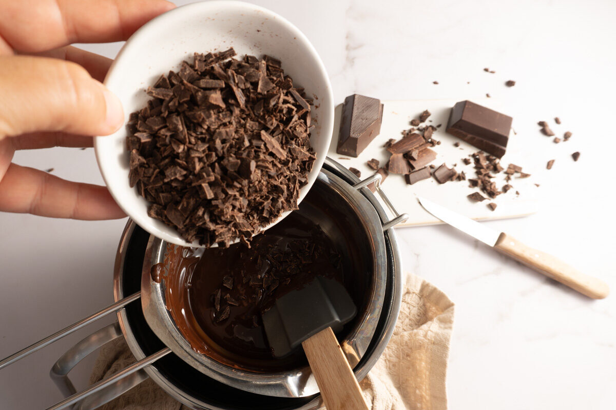 Zartbitterschokolade schmelzen und etwas auskühlen lassen.