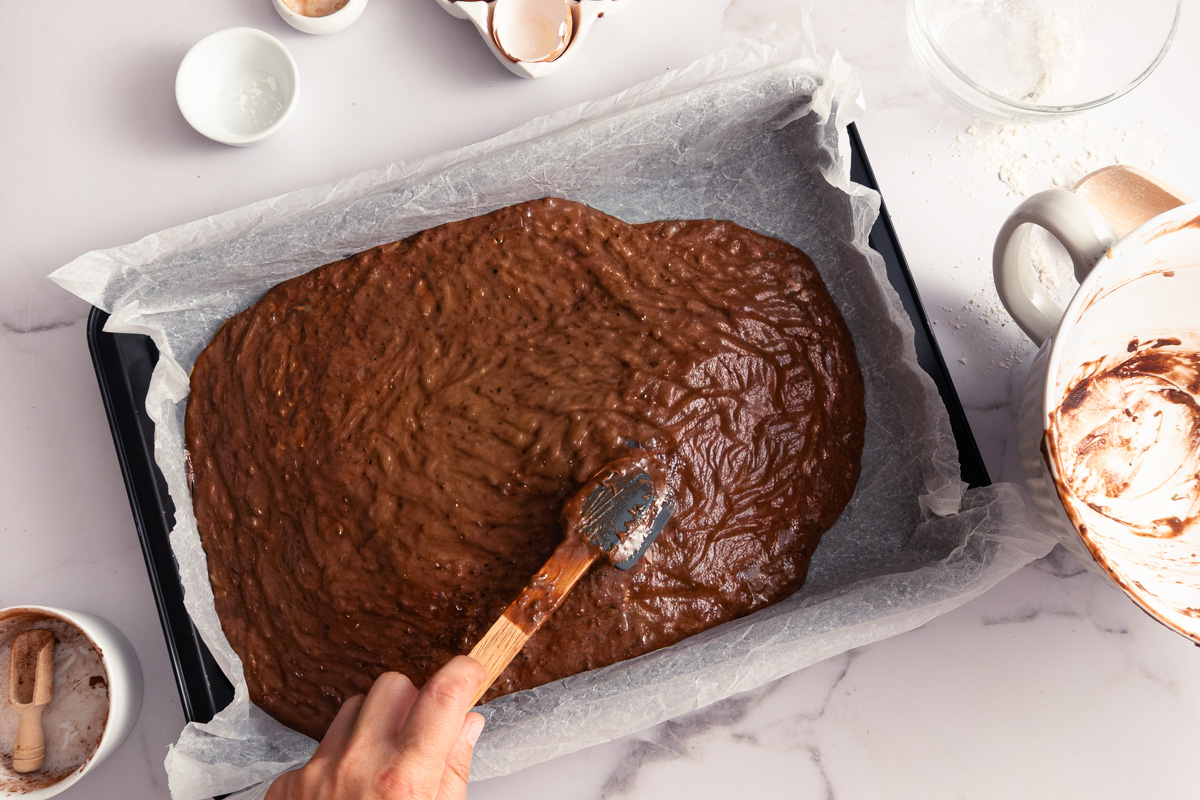 Gib den Teig auf das vorbereitete Blech mit Backpapier und streiche alles mit einem Teigschaber glatt. Noch besser als mit einem Teigschaber funktioniert das glattstreichen mit einer Streichhilfe oder einer Tortenschaufel.
