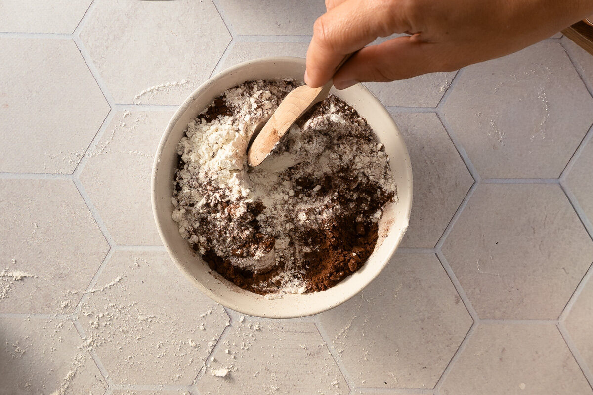 Vermische Mehl, Kakaopulver und Backpulver und rühre die trockenen Zutaten unter.