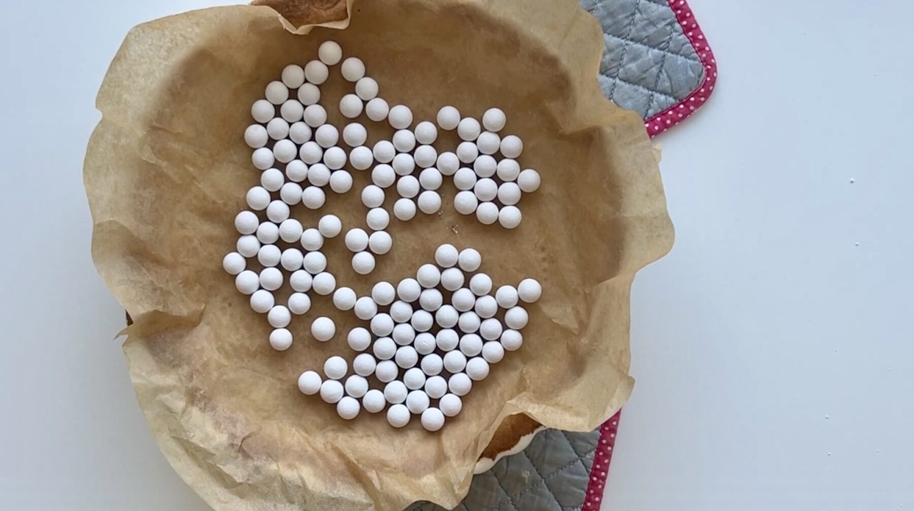 Für 20 min bei 180° backen.Abkühlen lassen und die Blindbackkugeln entfernen