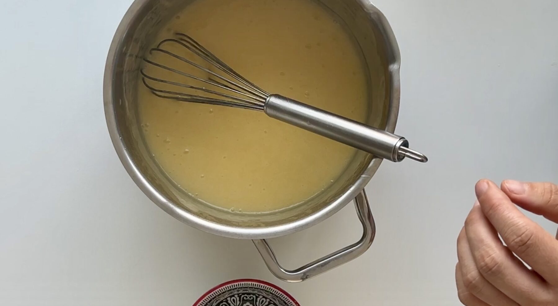 Alle Zutaten (bis auf die Butter) in einen Topf geben und unter ständigem Rühren die Mischung zum Kochen bringen. Die Mischung ca. 3 Minuten köcheln lassen, dabei kontinuierlich rühren, bis sie eindickt. Den Herd zurückschalten und nach und nach die Butter mit einem Schneebesen einrühren, bis eine glatte Masse entsteht. Vollständig abkühlen lassen.