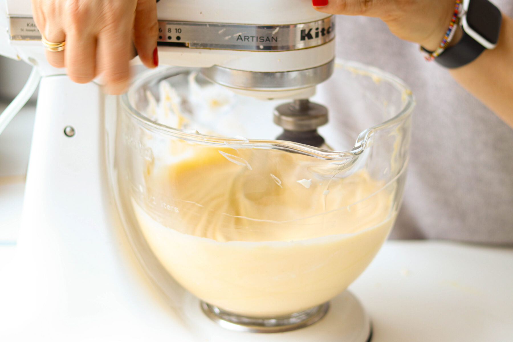 Die Sahne steif schlagen. Zuerst den Frischkäse in einer Schüssel aufschlagen und dann mit der geschlagenen Sahne vermengen. Zucker, Salz und Maisstärke miteinander verrühren und mit der Vanillepaste dazugeben. Alles gut miteinander verrühren. Anschließend ein Ei nach dem anderen zu der Masse geben und jeweils gut miteinander verrühren.