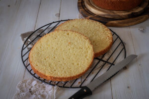 Bei diesem Rezept wird der Teig in zwei 20 cm Backformen gebacken. Die zwei Tortenböden haben nach dem Backen eine Höhe von ungefähr 4 bis 5 cm. Sie werden nochmals horizontal durchgeschnitten und ihr erhaltet dann vier Tortenböden für eure Torte.