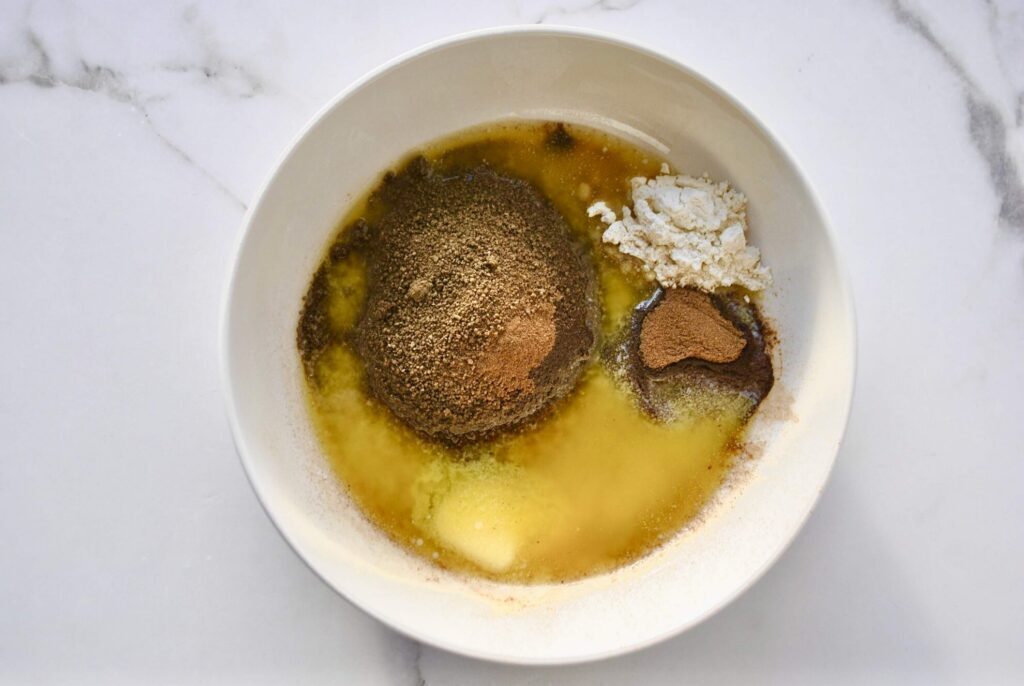 Für die Zimtfüllung die Butter in einer kleinen Pfanne zergehen lassen. Die flüssige Butter mit dem Vollrohrzucker, Zimt und Mehl vermengen.