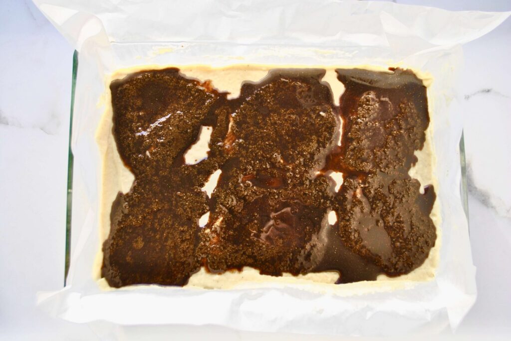 Beim Einziehen der Zimtfüllung gilt: weniger ist mehr. Zieh den Swirl nur leicht durch den Teig, damit das schöne Muster bleibt und die Füllung sich nicht komplett vermischt.
