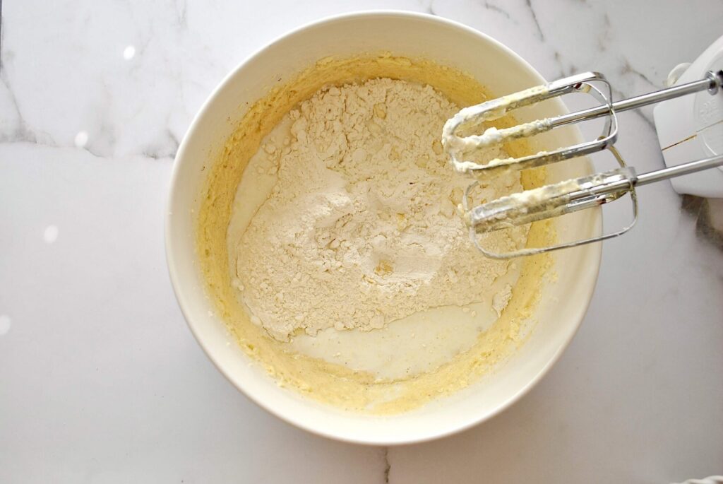 Zum Schluss geben wir das Mehl, Backpulver Salz und Milch zum Teig. Nur noch solange vermengen bis ein homogener Teig entsteht.