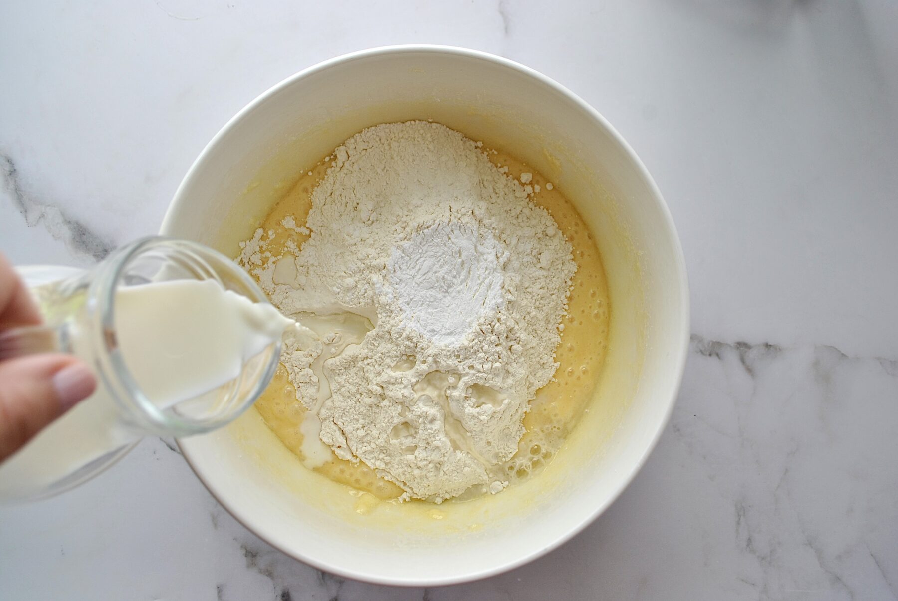 Das Mehl, Backpulver und Salz sowie die Milch zum Teig geben und nur noch vorsichtig vermengen bis ein glatter Teig entsteht.