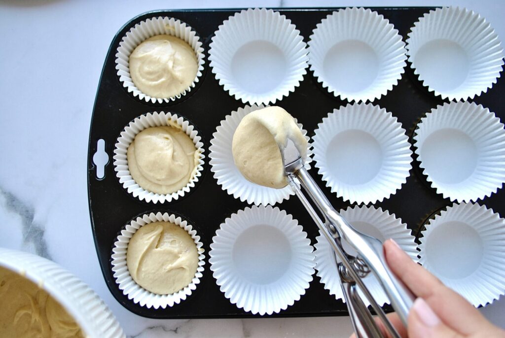 Mit Hilfe eines Eisportionierers kannst du den Teig am besten in die Papierförmchen füllen. So hast du direkt die richtige Menge im Förmchen. Die Papierförmchen sollten nur zu 2/3 gefüllt werden, damit der Teig Platz hat schön aufzugehen und nicht überläuft.