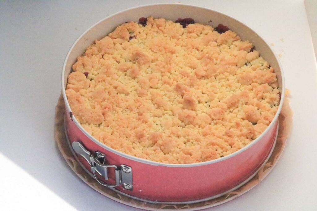 Bei 200 Grad Ober-/Unterhitze wandert Omas Kirschkuchen mit Streuseln jetzt auf mittlerer Schiene in den Ofen. Für etwa 35 Minuten muss der einfache Kirschkuchen backen, bis er gut durchgebacken ist. Je nach Ofen kann es auch mal 40 Minuten dauern, du siehst es an den Streuseln recht gut.