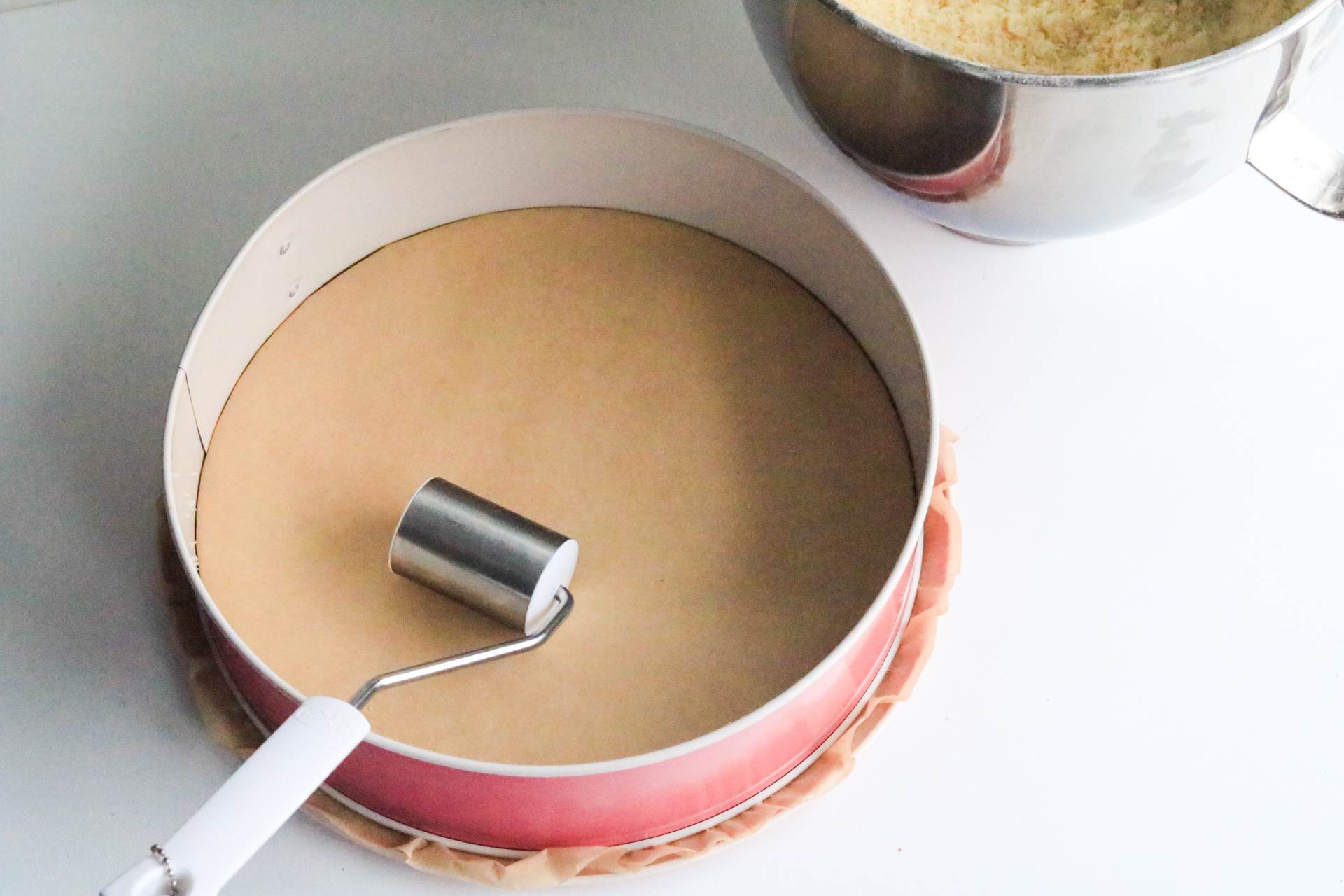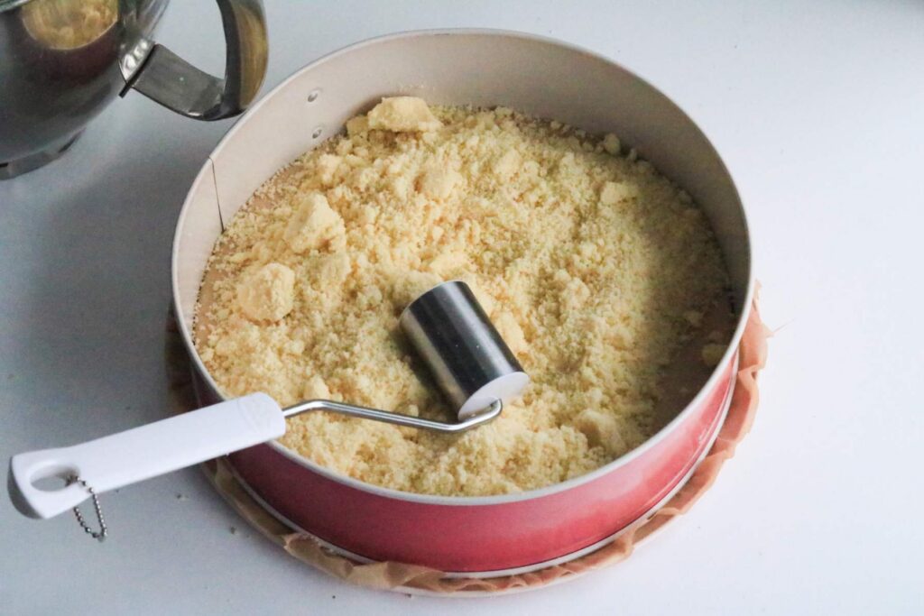 Die Hälfte der Streusel dann in die vorbereitete Springform füllen. Zuerst drücke ich den Boden mit den Händen fest, dann gehe ich nochmal mit einem eingefetteten Teigroller darüber und mache alles schön glatt!