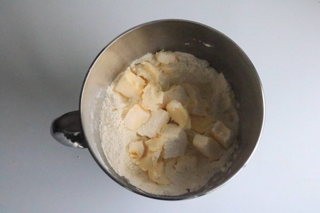 Für den Teig vermenge ich den kalten Butter in einer Rührmaschine zusammen mit dem Zucker sowie Vanillezucker und dem Mehl. Das kann man entweder mit der Hand machen oder mit der Küchenmaschine. Ich lasse meistens die Maschine die Vorarbeit leisten und knete dann mit der Hand etwas nach, damit schöne Streusel entstehen.