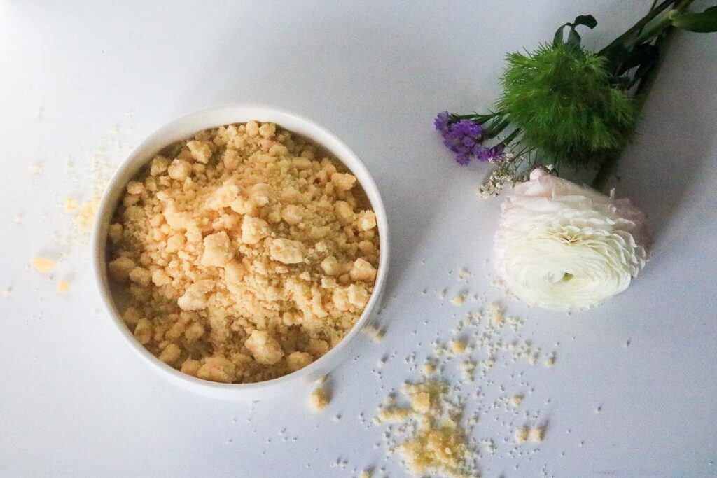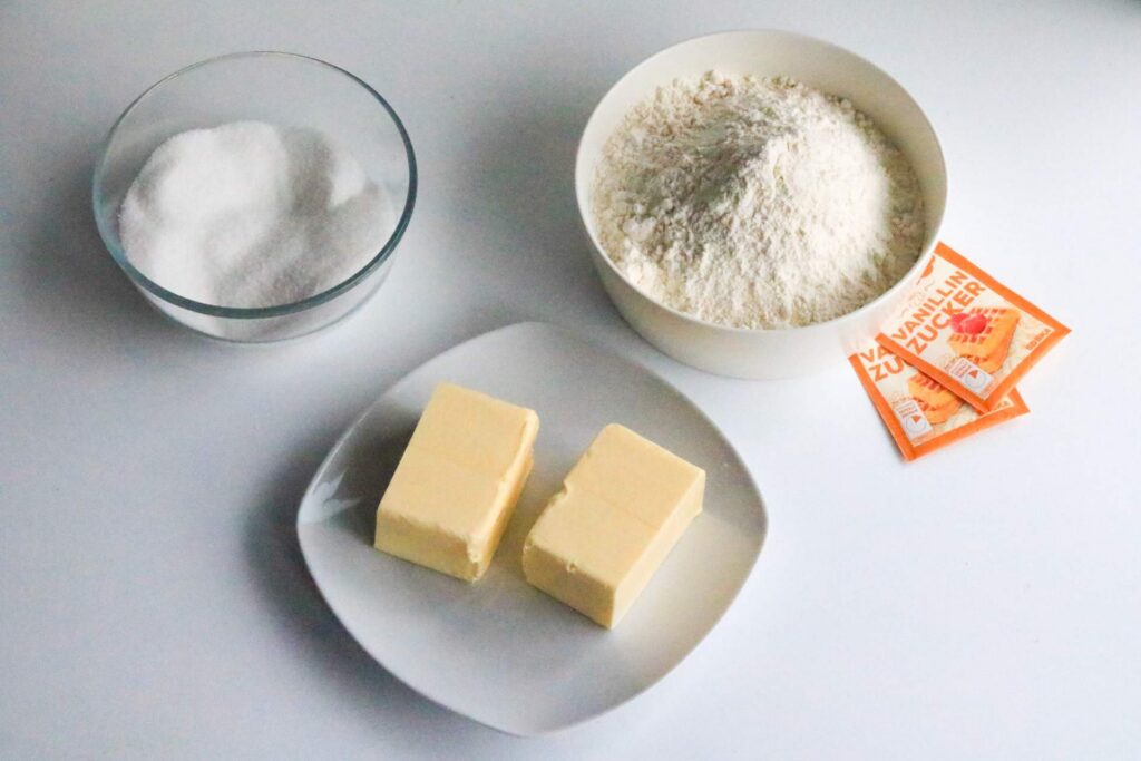 Wir starten damit, dass wir uns die Zutaten bereitlegen und abwiegen. So geht es gleich beim Backen schneller. Zum einen haben wir die Zutaten für den Boden und die Streusel.