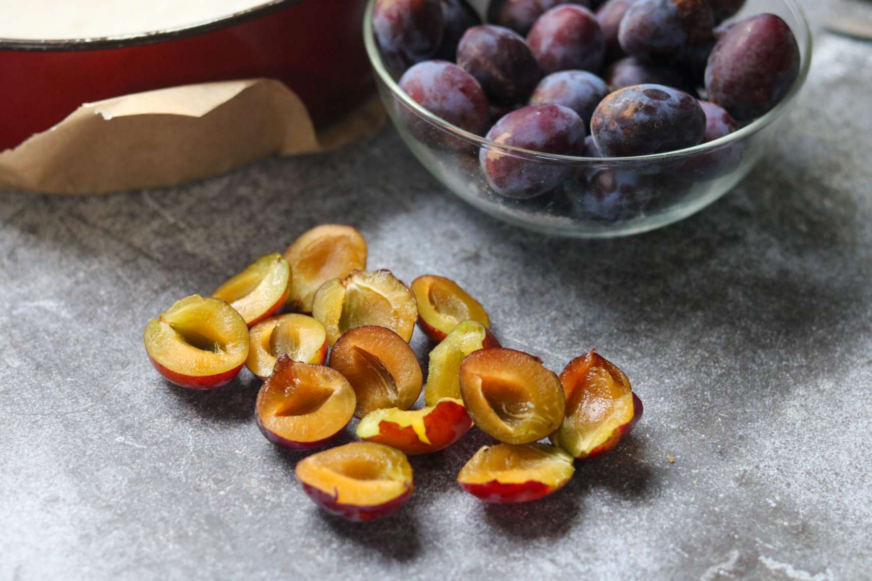 Dann die Zwetschgen waschen, halbieren und entkernen. Die Zwetschgenhälften auf dem Boden verteilen.