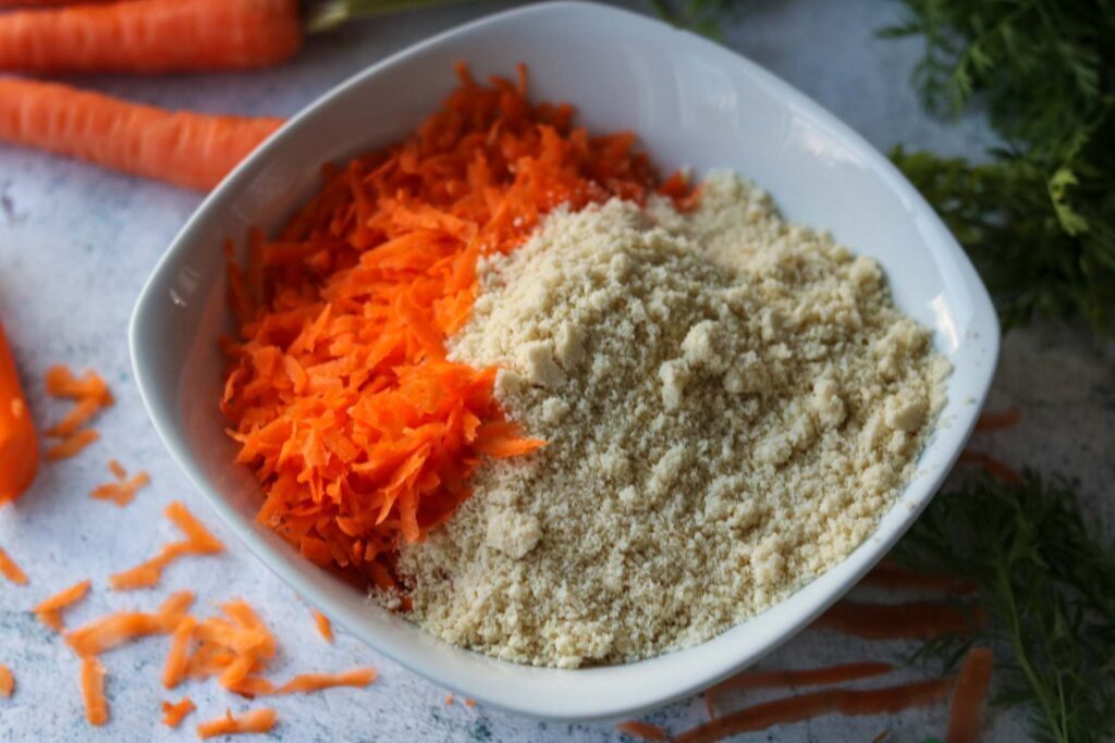 Die fein geraspelten Karotten vermenge ich mit den gemahlenen Mandeln.