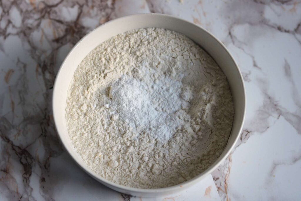 Im letzten Schritt kommt dann das Mehl zusammen mit dem Backpulver in den Teig. Vermenge es vorher in einer extra Schüssel miteinander.