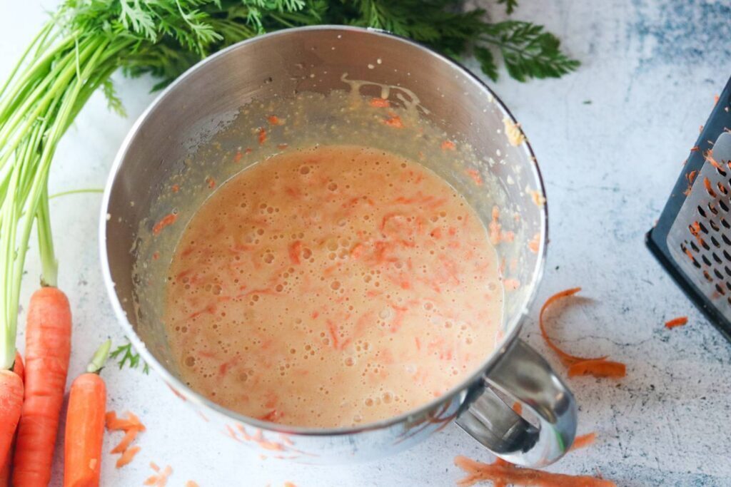 Die gemahlenen Mandeln mit den geraspelten Möhren vermengen und unter die Teigmasse rühren.