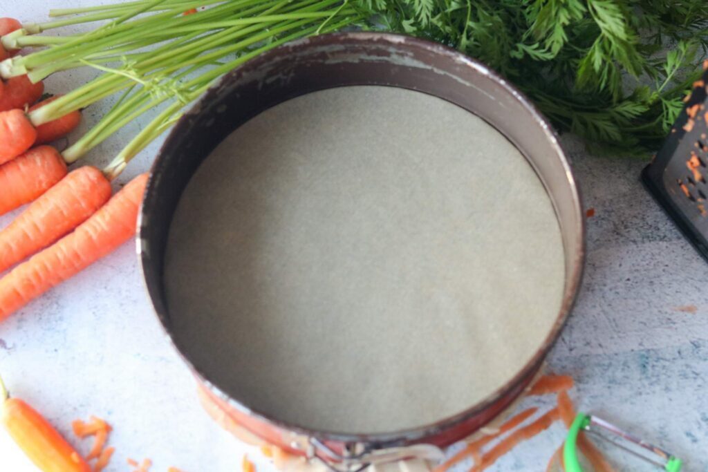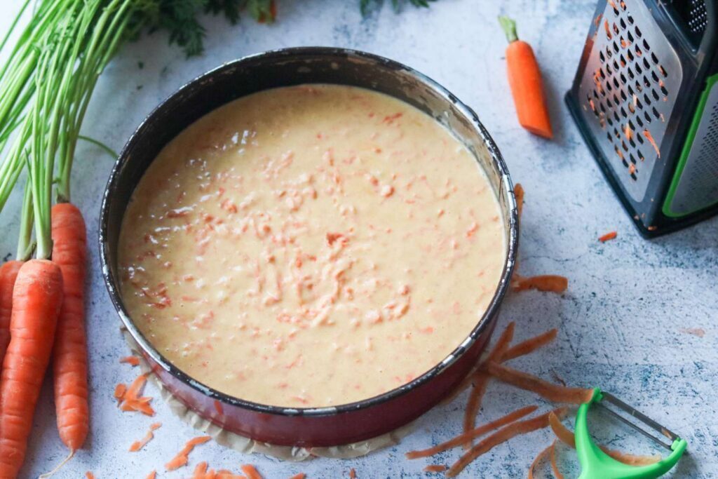 Wenn alles gleichmäßig untergearbeitet ist, kann der Teig in die vorbereitete Springform gefüllt werden. Normalerweise streiche ich meine Kuchenteige in der Springform immer noch etwas glatt damit sie gleichmäßig aufgehen. Das ist bei diesem Karottenkuchen aber gar nicht notwendig, weil der Teig recht flüssig ist. Es reicht die Form einfach etwas hin und her zu schwenken.