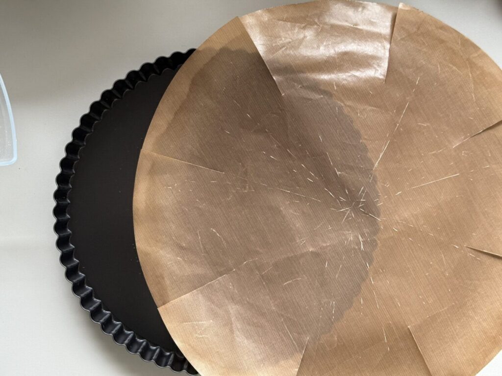 Eine Tarteform mit Backpapier belegen. Alternativ gut einfetten.