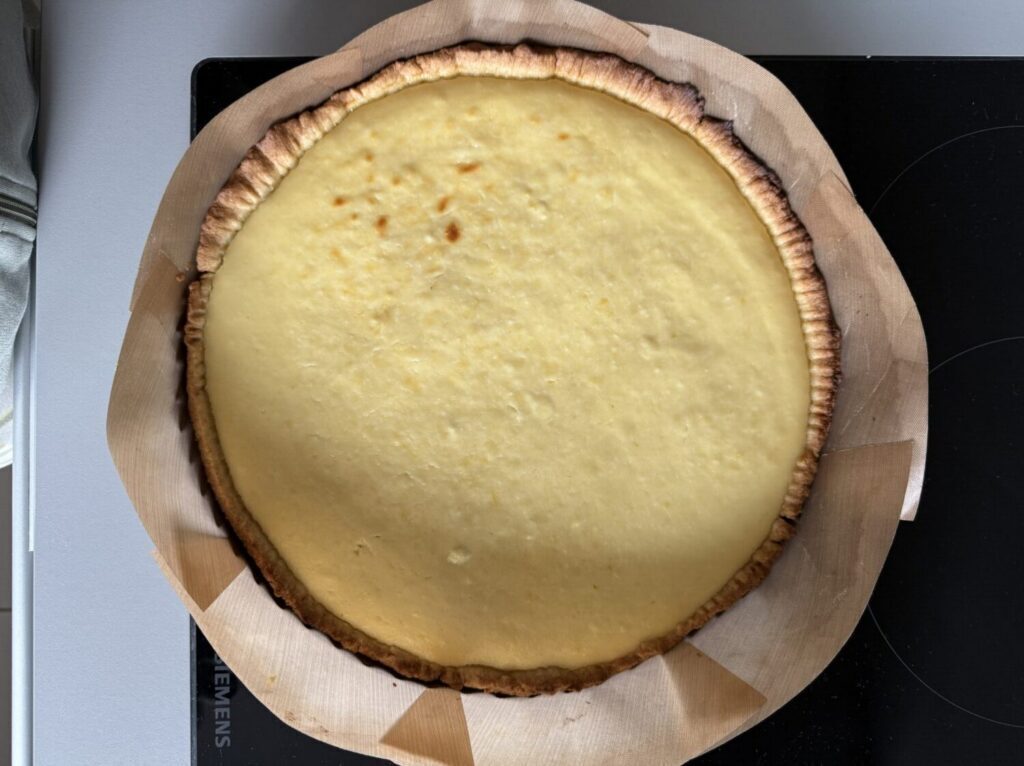 Den Rand mit einem Messer gleich schneiden (einfach so hoch wie die Tortenform). Mit überschüssigem Teig kann man die Löcher und Unebenheiten ausbessern oder damit Kekse backen. Mit einer Gabel den Boden mehrfach durchstechen und die Ränder leicht andrücken. Die Ricotta und Zitronen Creme kommt nun auf die Tarte.