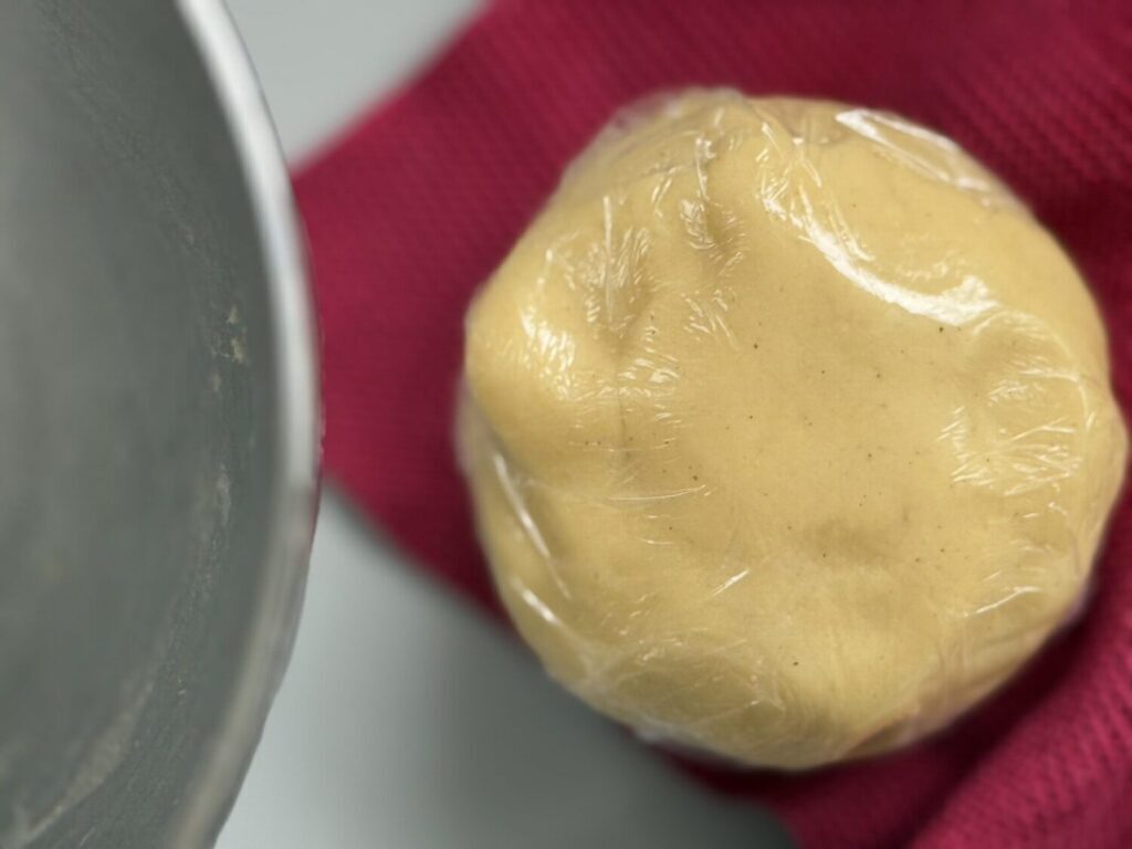 Den Teig wickeln wir in Plastikfolie und lassen ihn 1 Stunde im Kühlschrank ruhen.